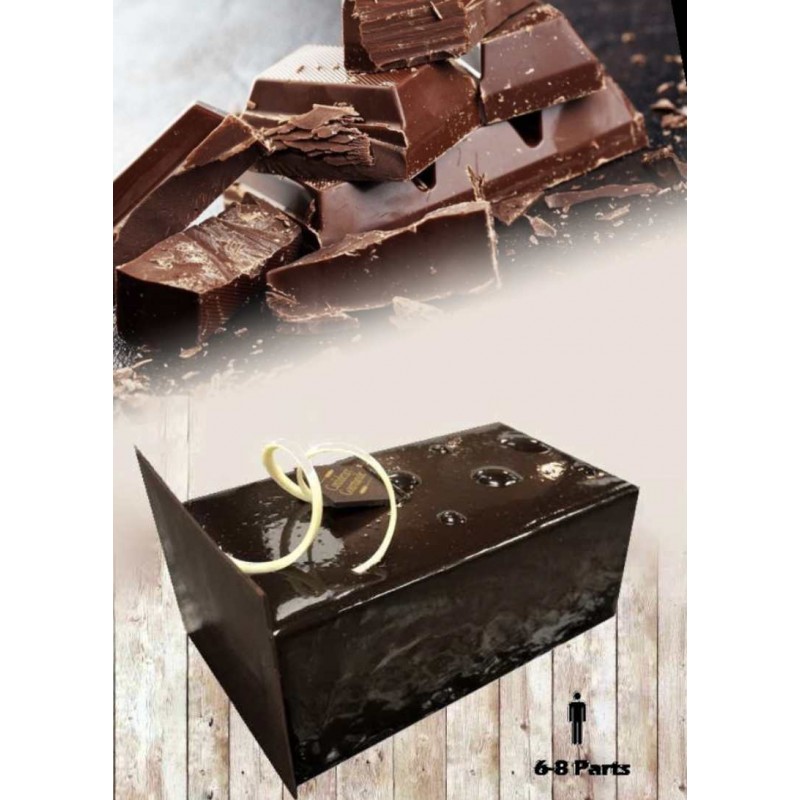 Croustillant praliné, biscuit brownie, insert vanille, crèmeux chocolat, glaçage chocolat